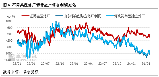 但是从生产效益来看,目前沥青生产效益极差,特别是独立炼厂沥青生产陷入深度亏损的态势中,据卓创资讯数据测算,4月各类型炼厂沥青生产理论综合利润均值如下:江苏主营炼厂为46.34元/吨,环比下滑123.30元/吨,同比下滑328.85元/吨;山东综合型独立炼厂为-1048.52元/吨,环比下滑79.45元/吨,同比下滑865.12元/吨;河北简单型独立炼厂为-964.68元/吨,环比下滑71.07元/吨,同比下滑857.28元/吨。因此即便是5月原油月均价走低且稀释沥青贴水下滑,但是也仅能够小幅减轻沥青生产的亏损,不足以使得沥青生产由亏转盈,从5月份沥青排产计划上也可以得到相似的结论。