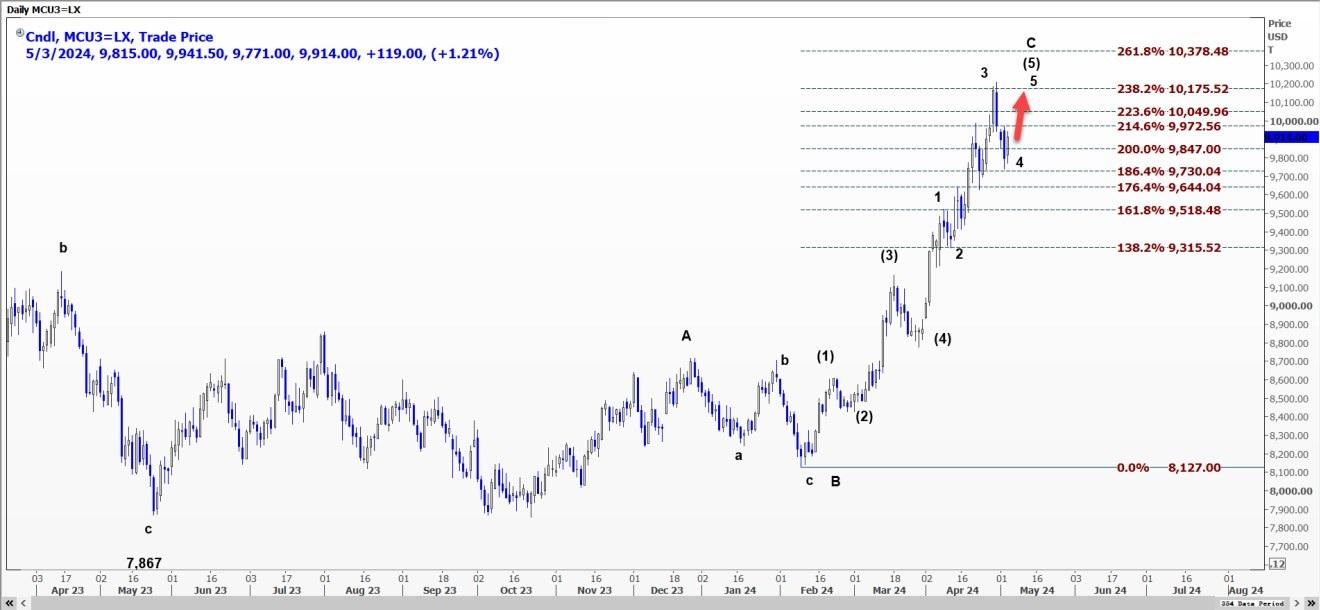 受第5波推动,伦敦金属交易所(LME)铜本周可能重新触及4月30日的高点10208美元/吨。