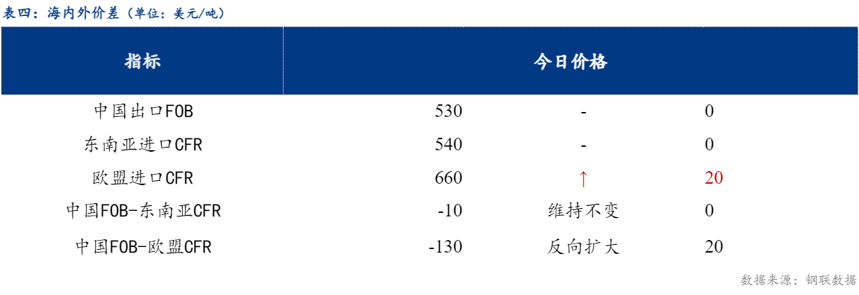 从海内外价差情况来看,中国热卷出口在530美元/吨,较上一交易日持平;欧盟进口价格660美元/吨,较上一交易日上涨20元/吨。
