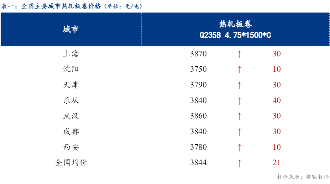 截止发稿时4.75热轧板卷全国均价3844元/吨,较上一交易日上涨21元/吨。其中主要城市价格为上海3870元/吨,沈阳3750元/吨,天津3790元/吨,乐从3840元/吨,武汉3860元/吨,成都3840元/吨,西安3780元/吨。