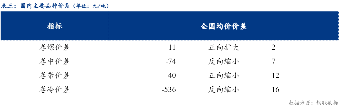 从品种价差来看,卷螺差较上一交易日正向扩大2元/吨,热中价差较上一交易日反向缩小7元/吨,热带价差较上一交易日正向缩小12元/吨,热冷价差较上一交易日反向缩小16元/吨 。
