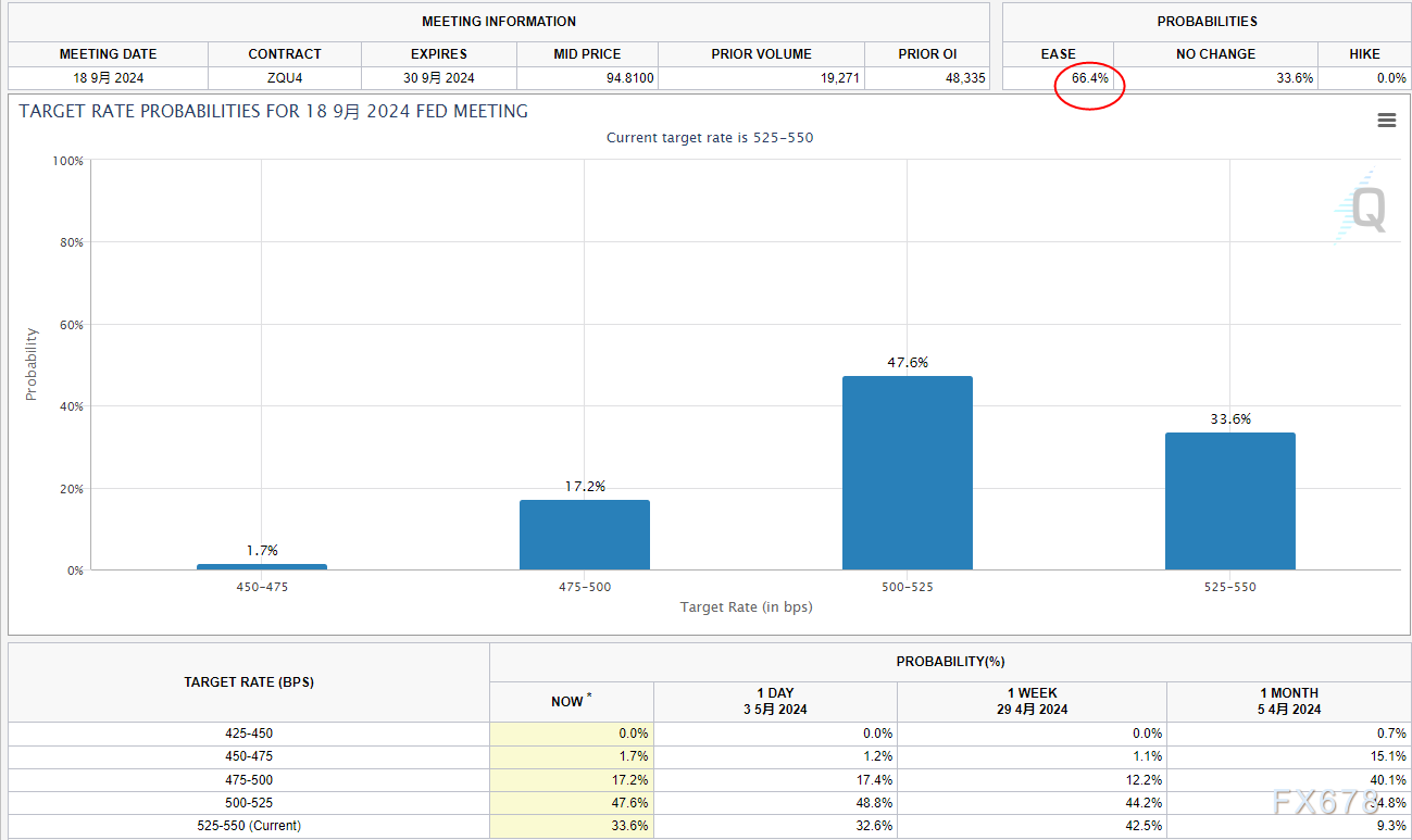 根据芝商所(CME)的FedWatch工具,市场周一预计9月降息的可能性约为66%。