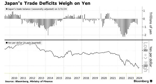 当日本在2022年9月10多年来首次进入市场以支撑日元时,这推动了日元兑美元两位数的升值。这一次,尽管上周两次被怀疑干预汇市,但加拿大皇家银行资本市场和美国银行等公司的分析师预计,由于收益率差和贸易逆差给日圆带来走软压力,日元将回落至1美元兑160日元。