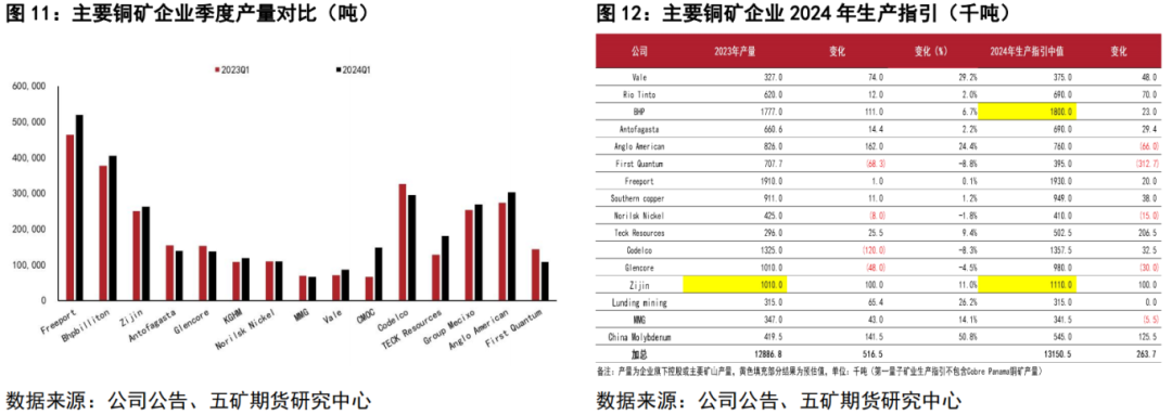 另外,尽管4月铜矿供应扰动增多,但从主要铜矿企业的一季报和全年产量预估看,预计供应扰动影响偏短期。统计的15个大中型铜矿企业一季度产量加总为314.2万吨,同比增长6.7%,增量主要由自由港、必和必拓、波兰铜业、淡水河谷、洛阳钼业、泰克资源和英美资源贡献;安托法加斯塔、嘉能可、智利国家铜业和第一量子产量降幅较大。从全年产量指引看,大部分矿企维持全年指引不变,淡水河谷、自由港、南方铜业和智利国家铜业上调了全年产量指引,当前预计主要矿企年内产量较2023年增加约26.4万吨。