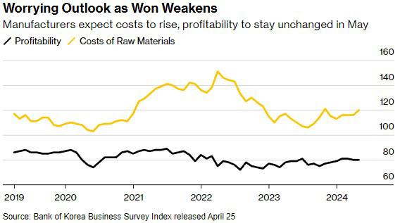 韩元的迅速疲软正让部分过往受益于汇率的出口商焦躁不安。作为全球出口国和科技供应链中的重要一员,韩国可谓如鱼得水。但该国出口很大程度上依赖于原材料进口,而随着韩元走弱,原材料成本逐渐提升,同时在日益增长的离岸外包趋势下,美元收益未必能尽数回流。