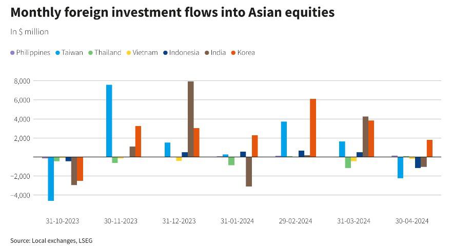 亚洲主要市场4月外资温和流出,这主要是受到美国国债收益率上升的推动,因交易员预计美联储将在更长时间内维持利率高位,以应对通胀压力。