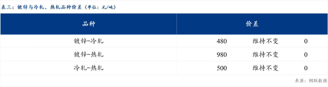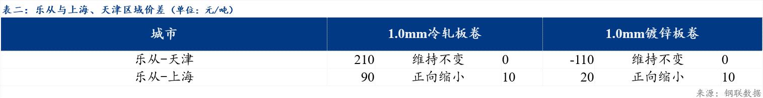 今日冷轧板卷乐从与天津价差较上一交易日持平,乐从与上海价差较上一交易日收窄10元/吨;镀锌板卷乐从与天津价差较上一交易日持平,与上海价差较上一交易日收窄10元/吨。品种价差方面,镀冷价差较上一交易日持平,镀热价差较上一交易日持平,冷热价差较上一交易日持平。