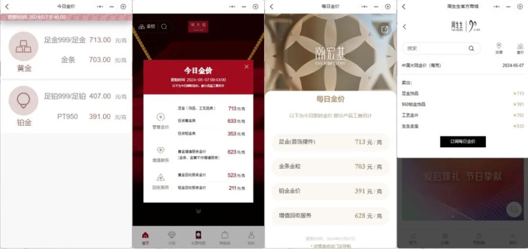 与此同时,此前火热的黄金首饰市场也出现小幅“降温”。5月7日,六福珠宝足金999/足金首饰、潮宏基足金(首饰摆件)、周大福足金(饰品、工艺品类)、周生生足金饰品、谢瑞麟足金饰品境内价格为713元/克,周大福足金(首饰、摆件类)价格为711元/克。而前述品牌4月17日的足金首饰境内零售价格突破了730元/克。