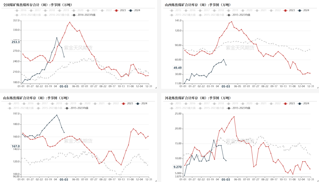 焦煤分环节库存来看,煤矿端继续去库,周环比-26.7万吨至253.26万吨;煤矿出货有一定放缓,大多数矿保持去库。