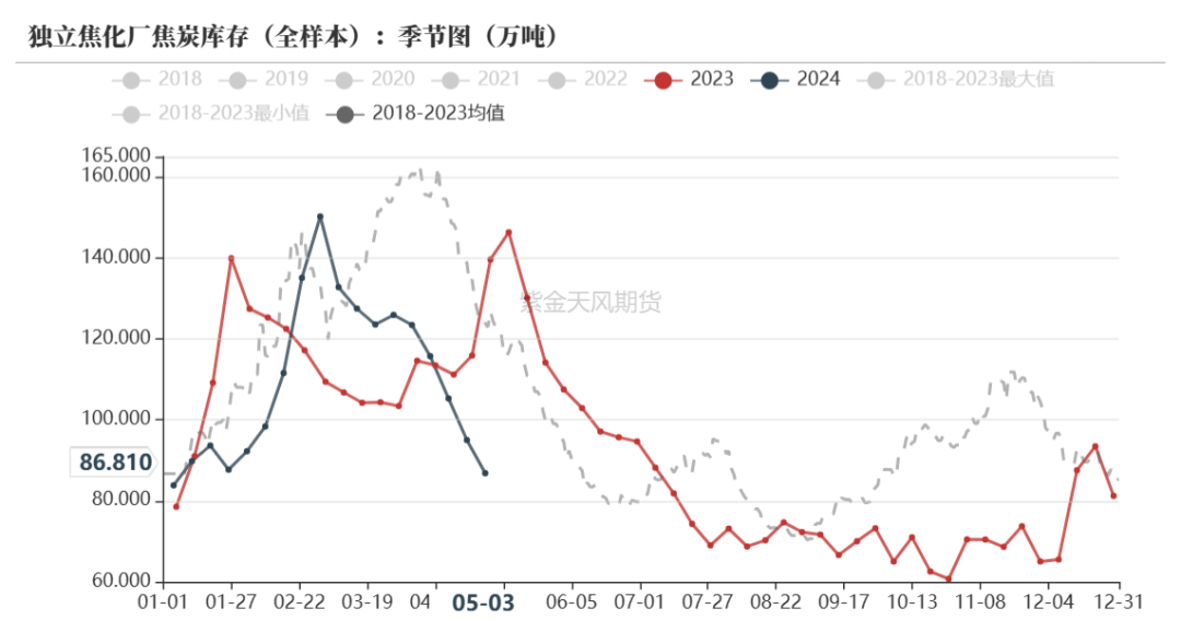 独立焦化厂全样本焦炭库存86.81万吨,周环比-8万吨;