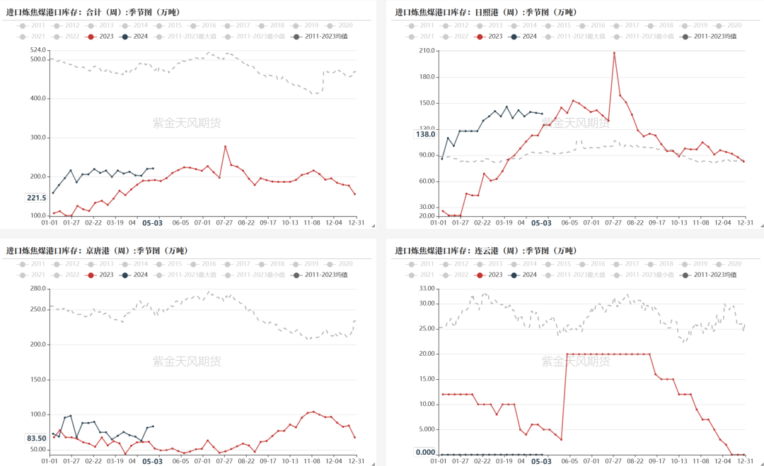 进口炼焦煤港口库存221.5万吨,周环比+1万吨。
