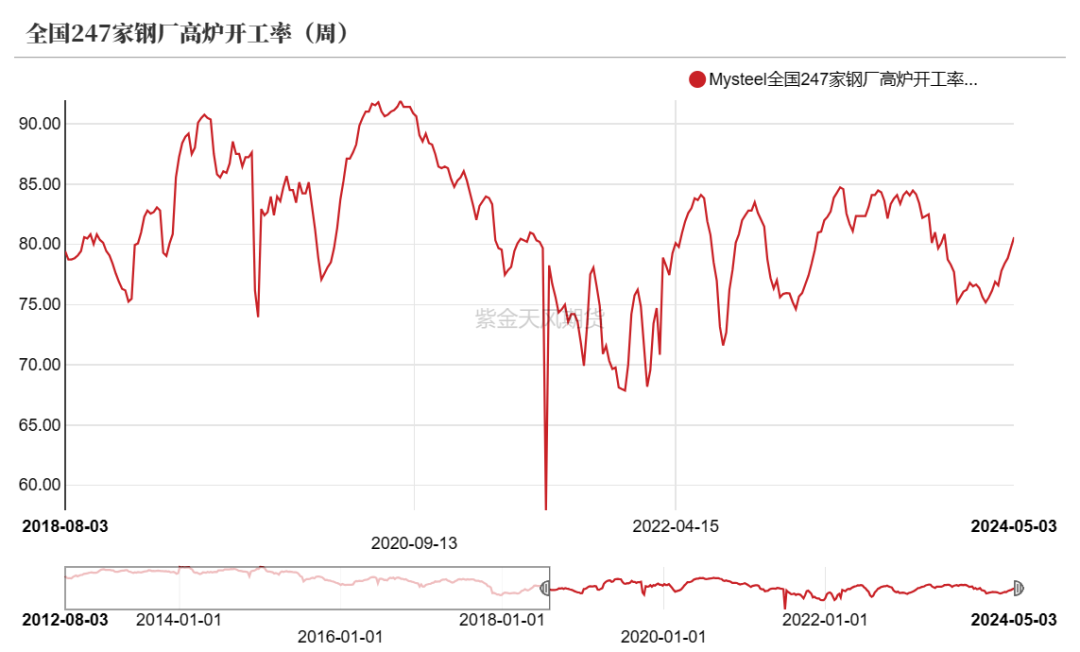 247家钢厂铁水日均产量230.7万吨,周环比+1.9万吨;247家钢厂高炉开工率80.6%,周环比+0.87%;