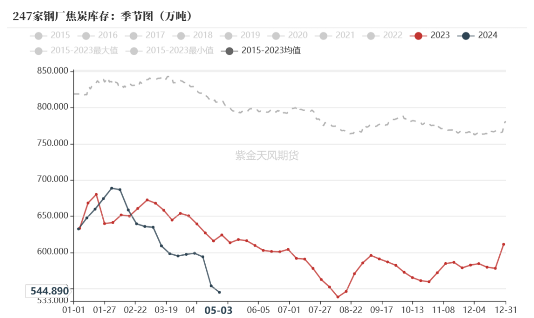 247家钢厂焦炭库存544.89万吨,周环比-8.9万吨;
