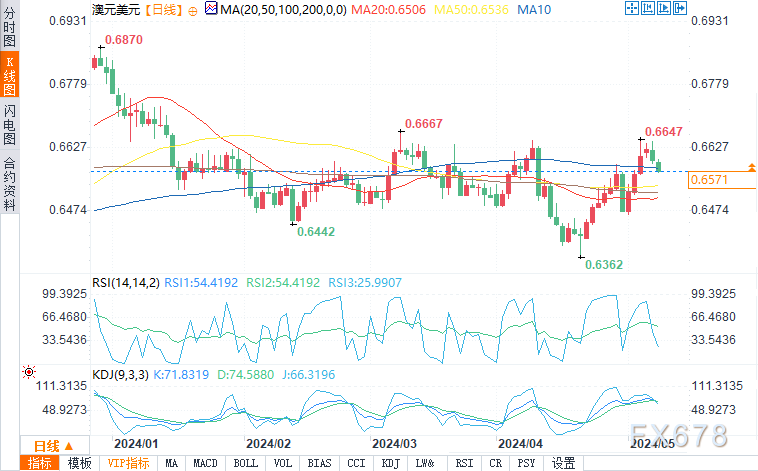 周三(5月8日)欧盘时段,澳元/美元缓慢走跌。1小时内,澳元/美元盘中触及0.6564的低点后小幅反弹至0.6571附近。