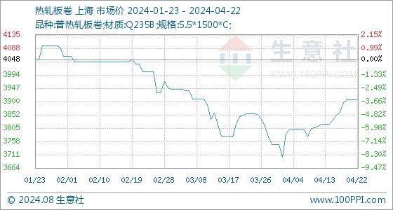 4月22日生意社热轧板卷基准价为3906.00元/吨