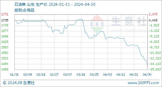 4月30日,生意社石油焦基准价为1512.50元/吨,与本月初(1675.00元/吨)相比,下降了-9.70%。