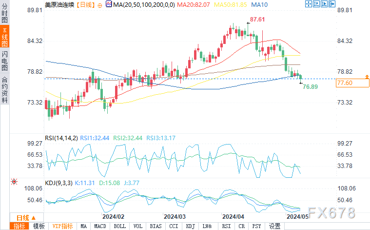汇通财经APP讯——周三(5月8日)欧盘时段,因库存增加且需求疲软,WTI原油延续前两日的跌势。盘中最低触及76.89美元后小幅反弹至77.71美元附近,跌幅约0.87%。