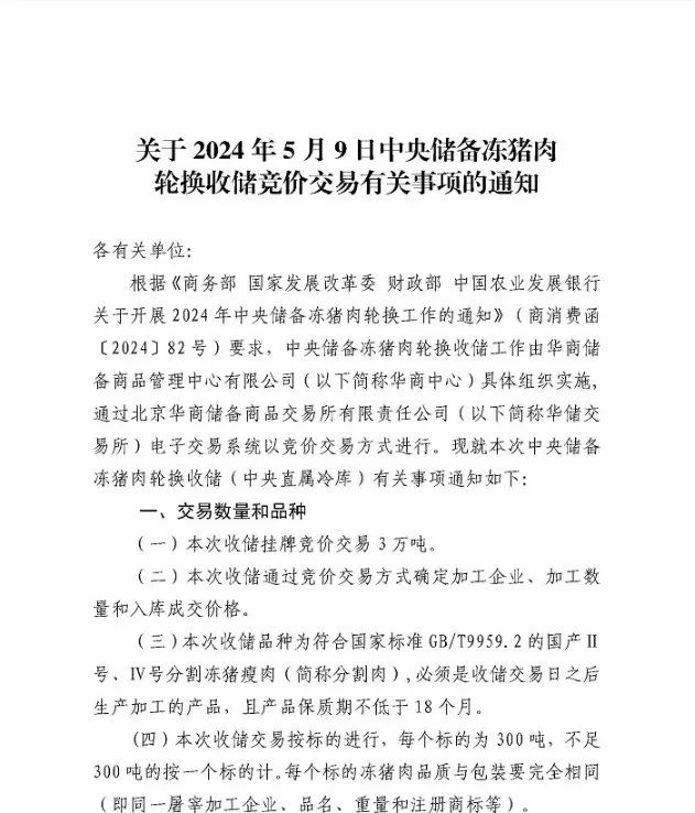 农财宝典新牧网讯 5月7日,华储网发布关于2024年5月9日中央储备冻猪肉轮换出库竞价交易有关事项的通知。