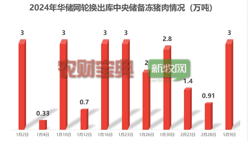 《农财智库》数据显示,华储网分别于5月9日、2月28日、2月23日、1月30日、1月26日、1月23日、1月16日、1月10日、1月2日公告出库竞价交易挂牌3万吨、0.91万吨、1.4万吨、2.8万吨、2万吨、3万吨、3万吨、0.7万吨、3万吨、0.33万吨、3万吨。粗略计算,2024年中央储备冻猪肉的出库量累计达到23.14万吨。