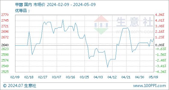 5月9日,生意社甲醇基准价为2654.17元/吨,与本月初(2651.67元/吨)相比,上涨了0.09%。