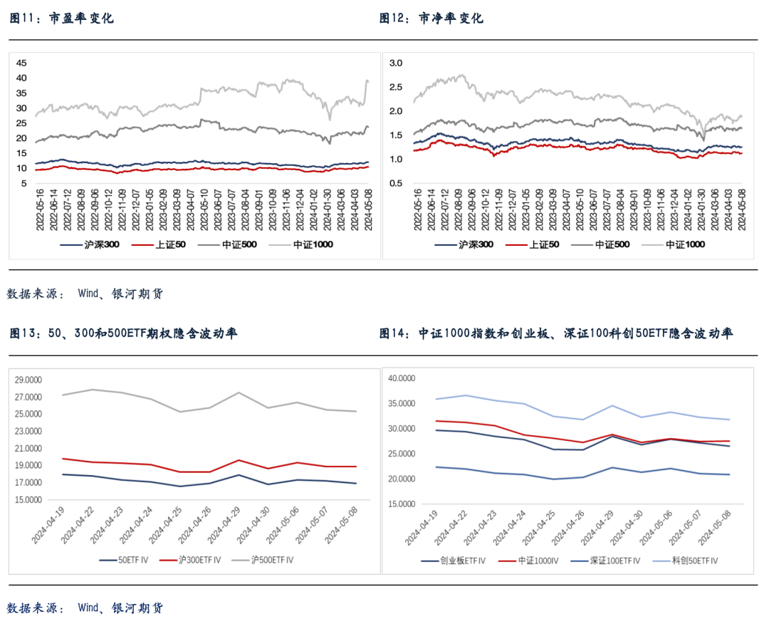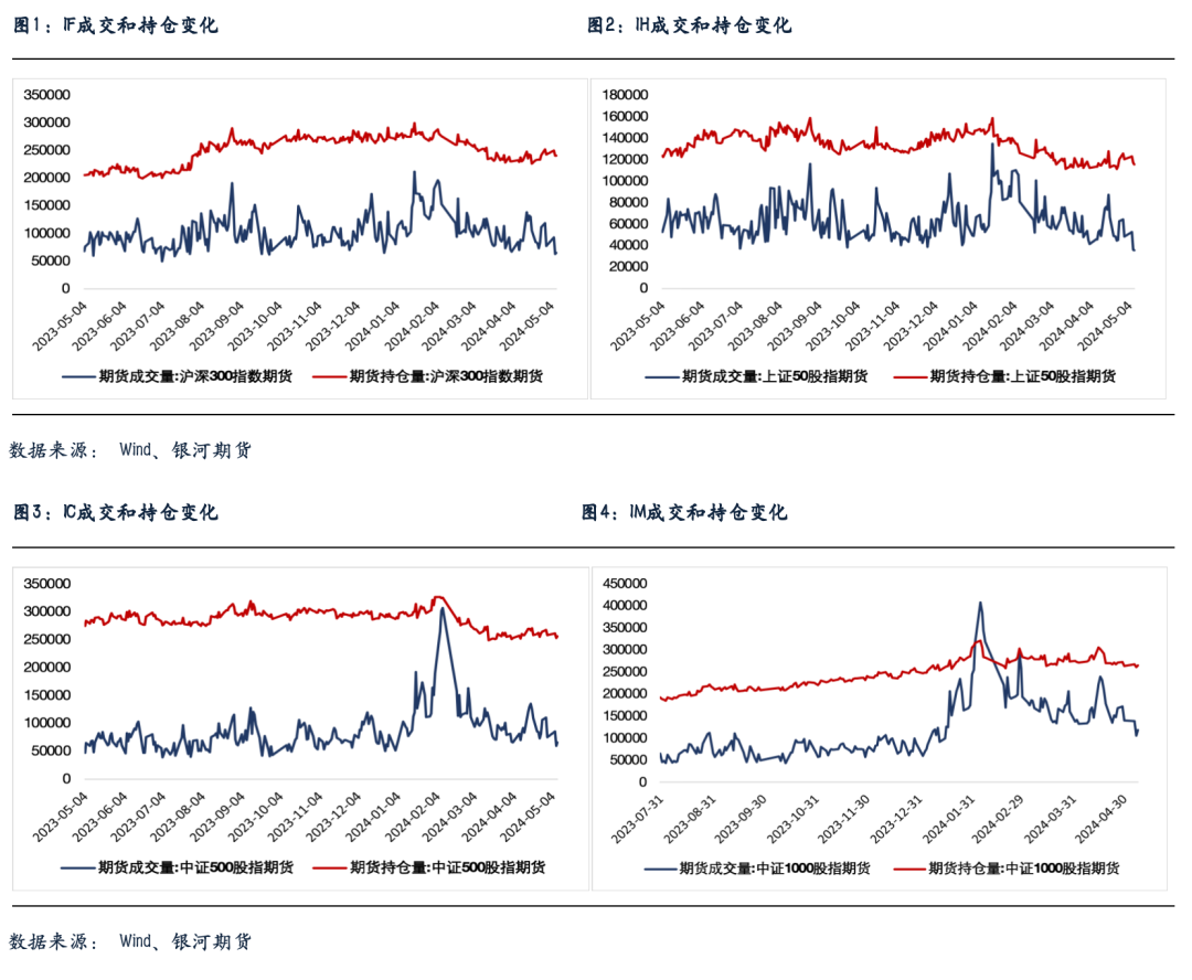 股指期货全线飘绿,至收盘,主力成交合约IH2405跌0.61%,IF2405跌0.83%,IC2405跌1.27%,IM2405跌1.55%。各品种基差继续下行,但IM当月合约贴水略有收敛。IC、IF和IM成交分别增加12.2%、3.7%和11.3%,IH成交下降0.5%。IC和IM持仓分别增加1.5%和1.6%,IF和IH持仓分别下降0.4%和1.6%。