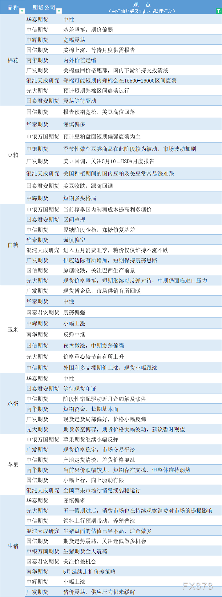 汇通财经APP讯——期货公司观点汇总一张图:5月9日农产品(棉花、豆粕、白糖、玉米、鸡蛋、生猪等)