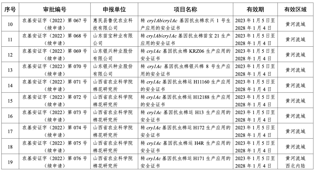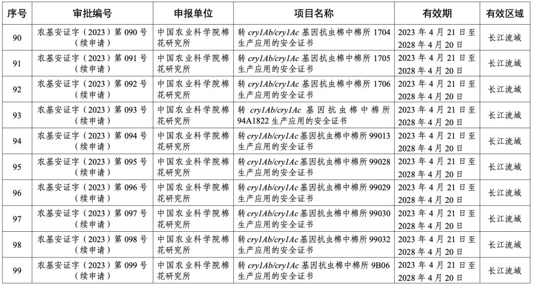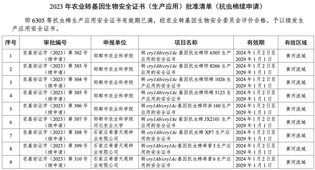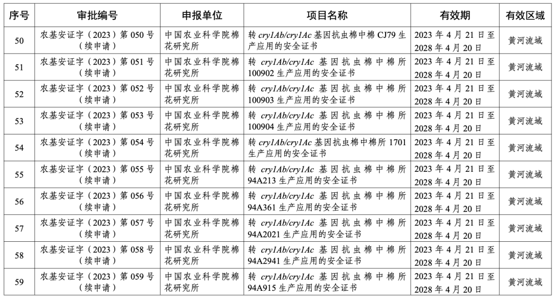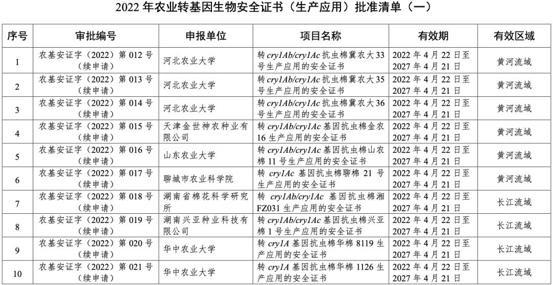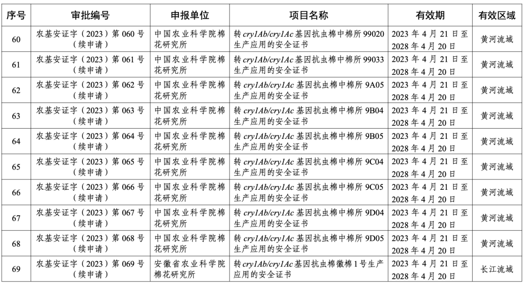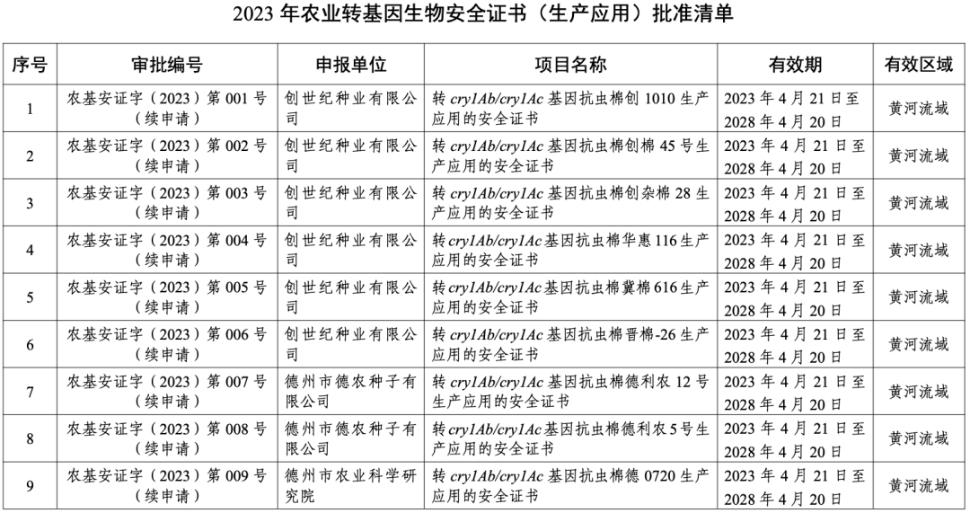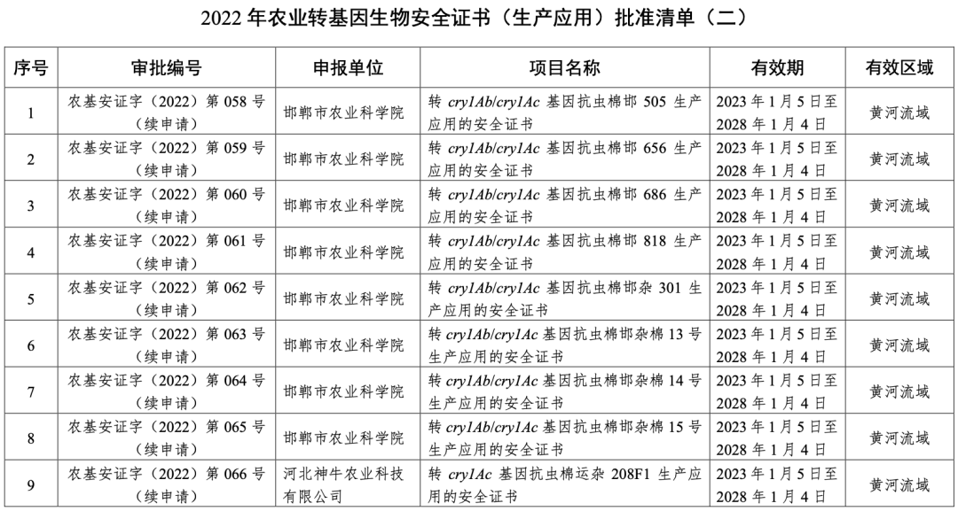 根据《农业转基因生物安全管理条例》及其配套规章,经农业转基因生物安全委员会评价合格,9项首次发放生产应用安全证书(2项基因编辑植物、6项动物用转基因微生物和1项转基因植物),55项有效期满续发生产应用安全证书(4项动物用转基因微生物和51项抗虫棉)。