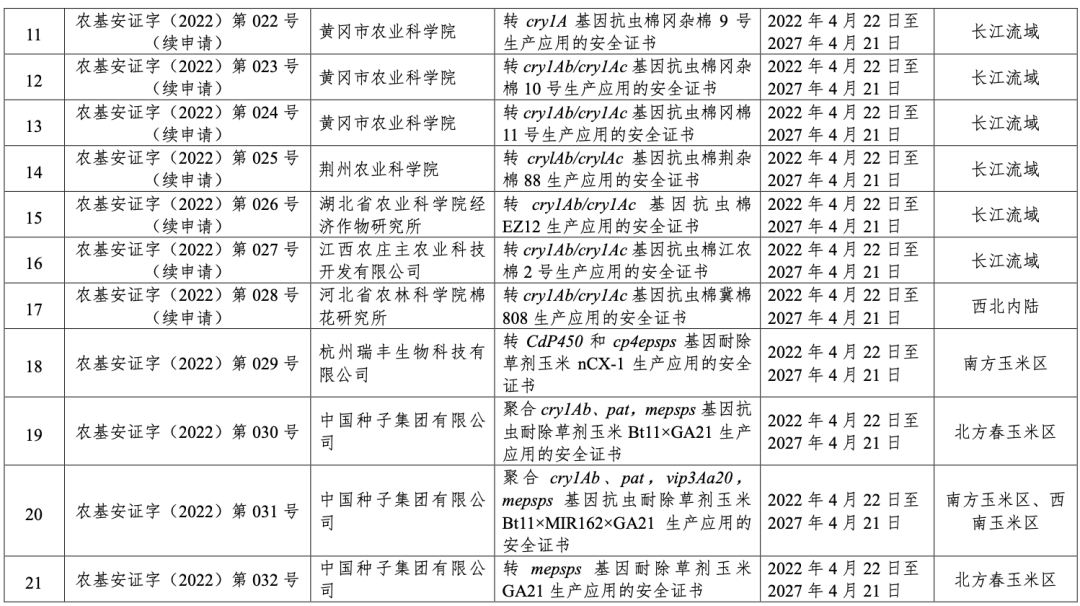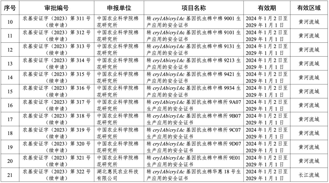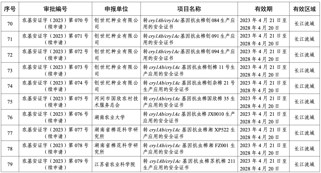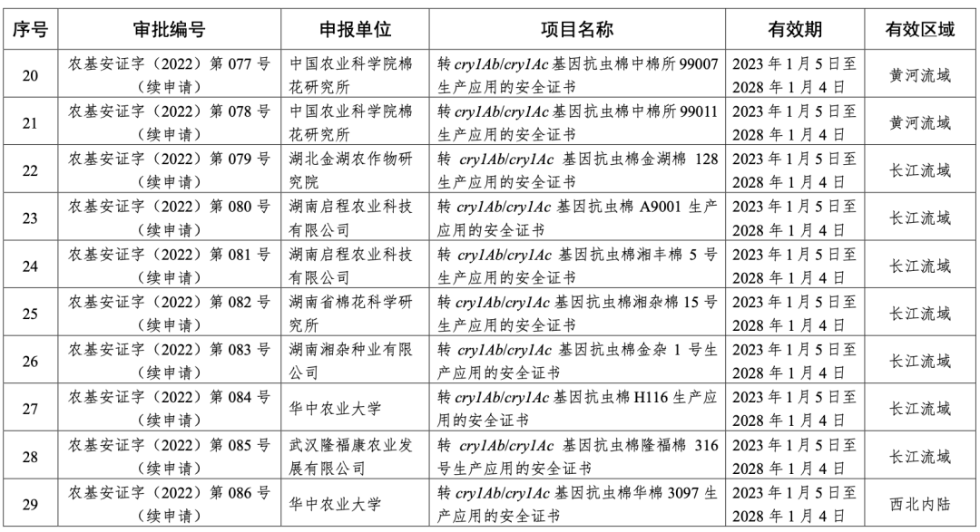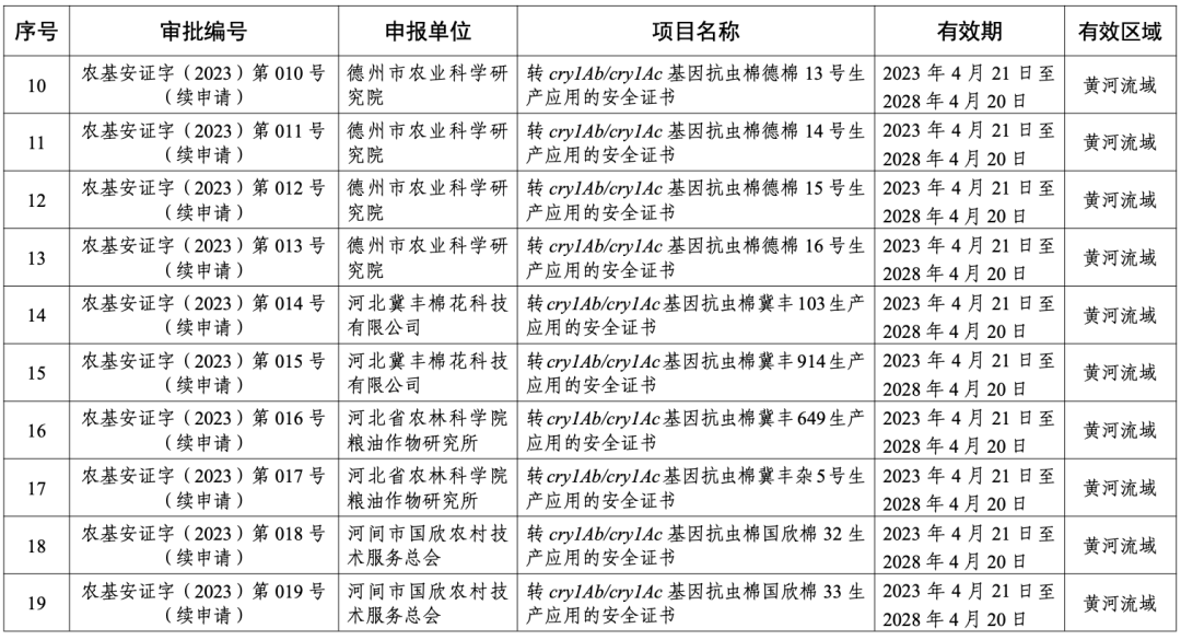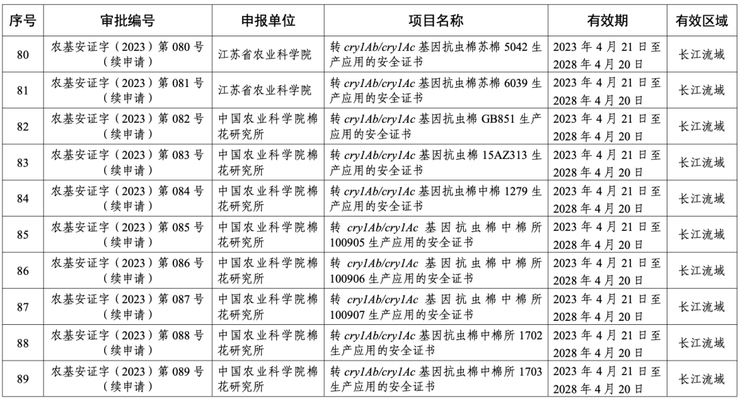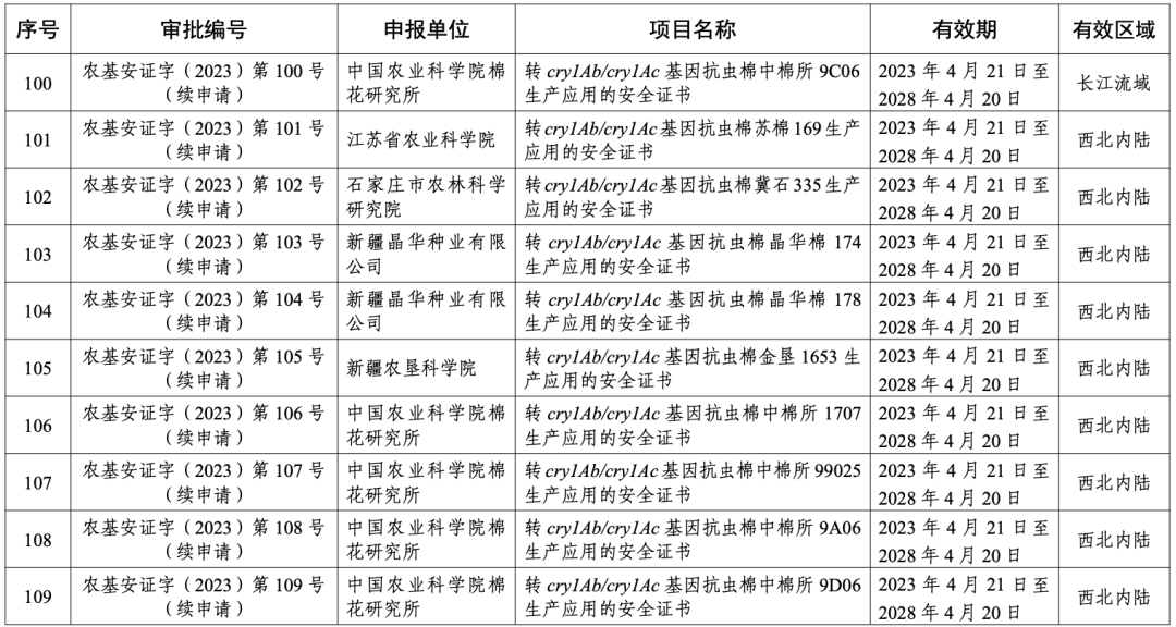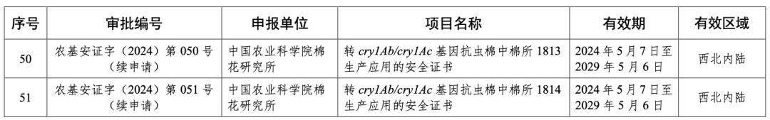 根据《农业转基因生物安全管理条例》及其配套规章,经农业转基因生物安全委员会评价合格,9项首次发放生产应用安全证书(2项基因编辑植物、6项动物用转基因微生物和1项转基因植物),55项有效期满续发生产应用安全证书(4项动物用转基因微生物和51项抗虫棉)。