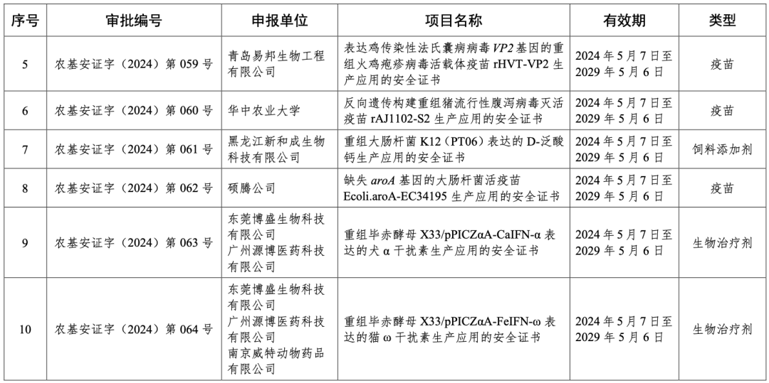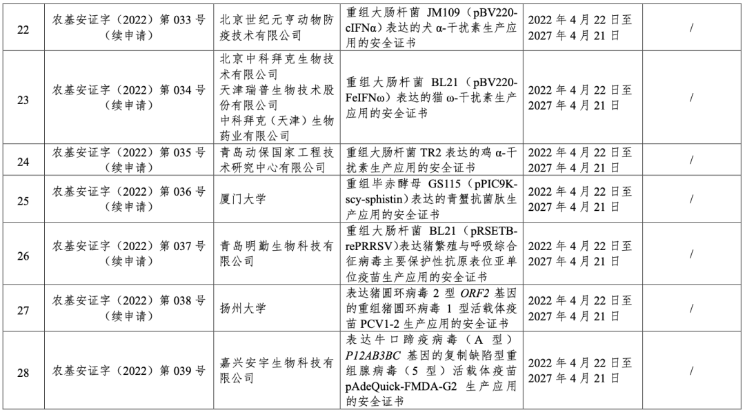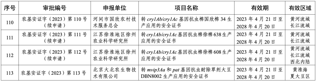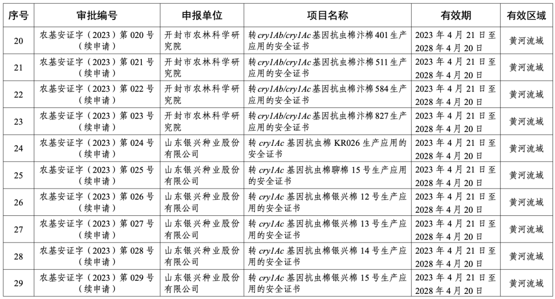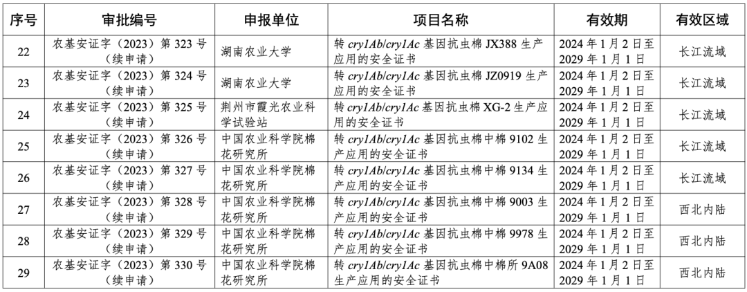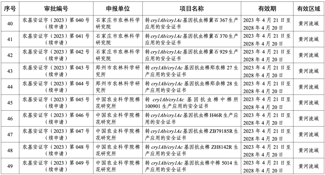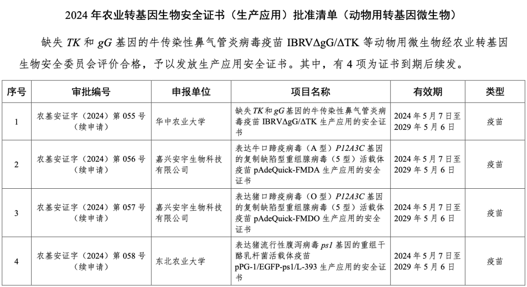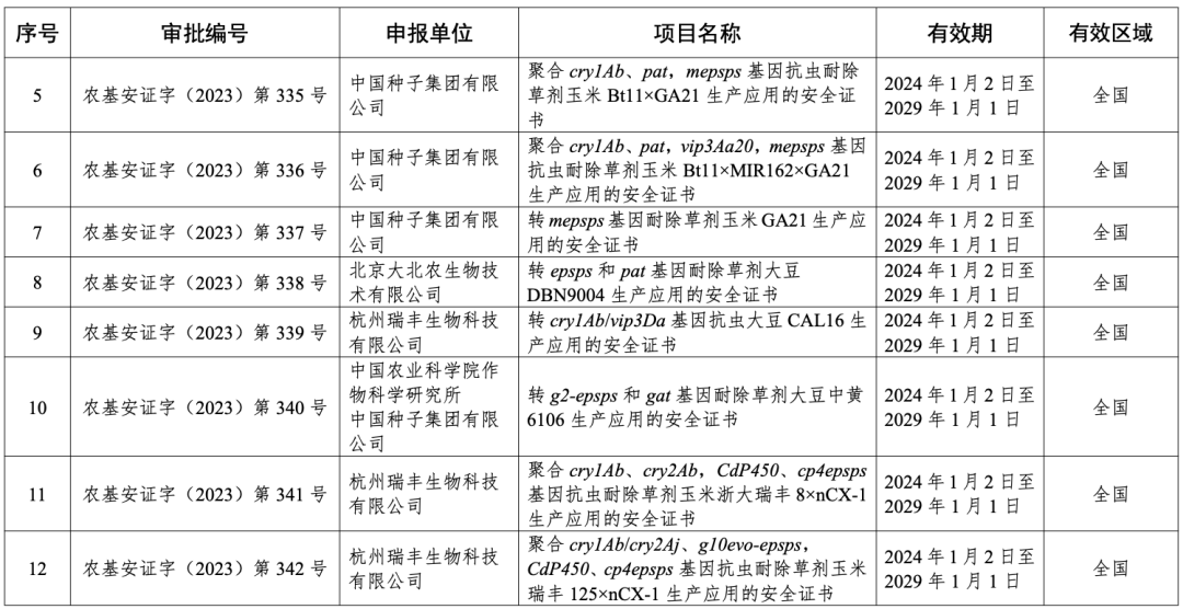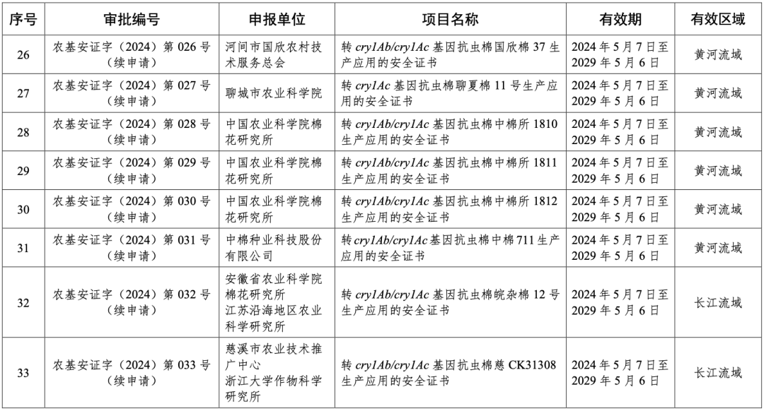 根据《农业转基因生物安全管理条例》及其配套规章,经农业转基因生物安全委员会评价合格,9项首次发放生产应用安全证书(2项基因编辑植物、6项动物用转基因微生物和1项转基因植物),55项有效期满续发生产应用安全证书(4项动物用转基因微生物和51项抗虫棉)。