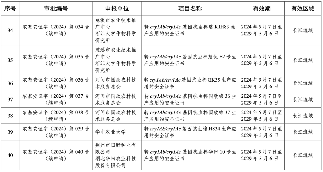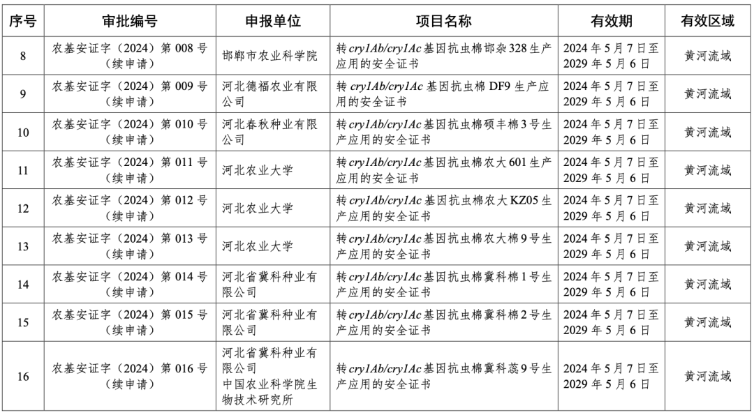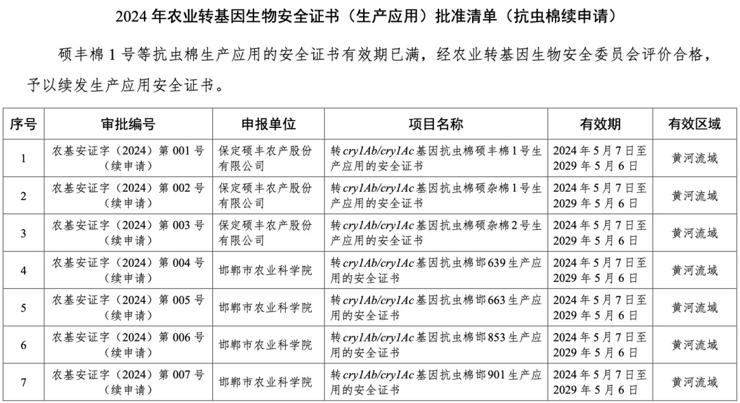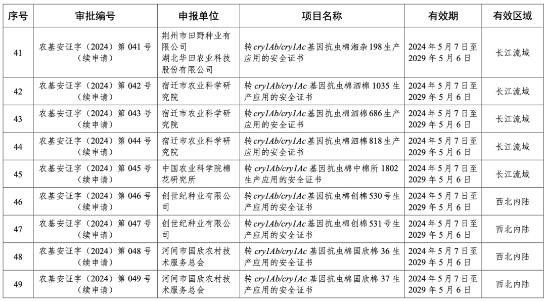 5月8日,农业农村部科教司发布2024年农业转基因生物安全证书批准清单(一),包括1项基因编辑产量性状改良玉米、1项基因编辑抗病小麦,10项动物用转基因微生物,1项抗虫耐除草剂玉米和51项转基因抗虫棉。