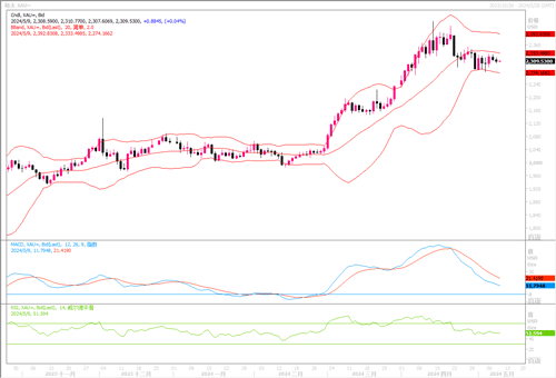 周三(5月8日),金价继续小幅下跌0.2%,收盘于2308.64美元。
