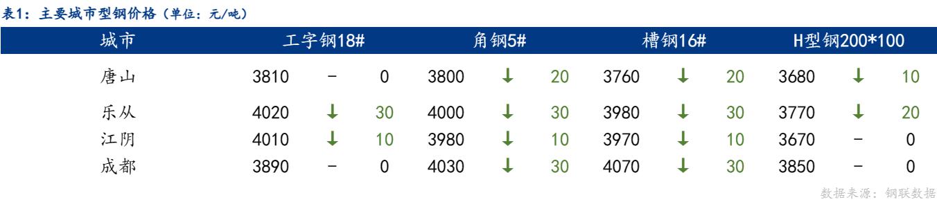 今日型钢价格稳中趋弱运行,唐山工字钢价格与上一交易日持平,角钢、槽钢、H型钢价格较上一交易日下跌10-20元/吨;乐从工字钢、角钢、槽钢、H型钢价格较上一交易日跌20-30元/吨 ;江阴工字钢、角钢、槽钢格较上一交易日跌10元/吨, H型钢价格较上一交易日持平;成都工字钢、H型钢上一交易日持平,角钢、槽钢价格较上一交易日下跌30元/吨。