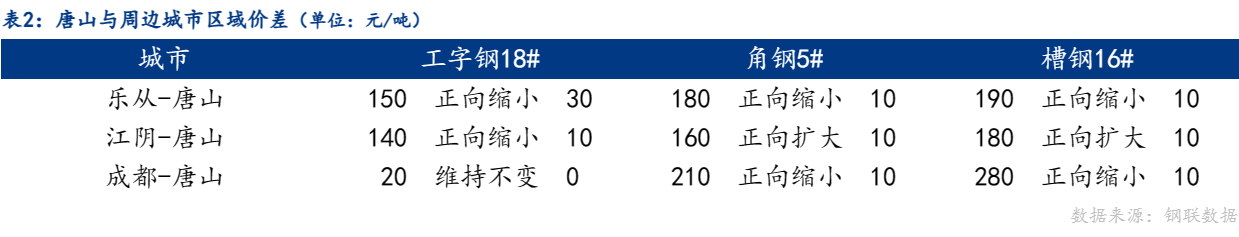 从区域价差来看,今日乐从工字钢、角钢、槽钢与唐山价差正向缩小;江阴工字钢与唐山价差正向缩小,角钢、槽钢与唐山价差正向扩大;成都工字钢与唐山价差维持不变,角钢、槽钢与唐山价差正向缩小。