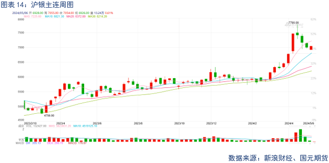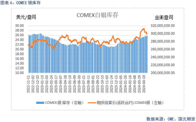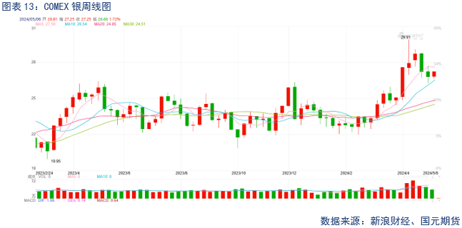 白银价格上周小幅下跌。上周的FOMC会议上,美联储如期保持利率不变,鲍威尔表示降息比预期漫长但不太可能加息。美国4月非农就业人口增加17.5万人远不及预期,失业率上升,薪资增幅放缓至3.9%。美国4月ISM制造业意外降至49.2,重新陷入萎缩。美国4月ISM服务业指数降至49.4,为2022年以来首次萎缩。美国经济数据表现不佳,通胀指标有所降温,美元偏弱运行,逾三周新低。同黄金类似,随着避险情绪持续降温,叠加白银库存持续累库,上周银价震荡偏弱,但美元走弱对银价有支撑,预计短期内银价震荡为主。