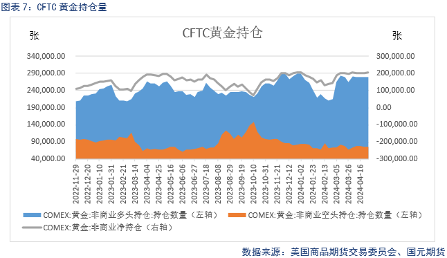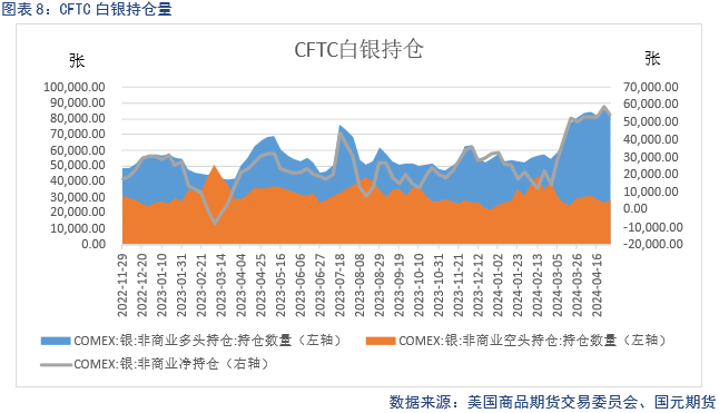 截止4月30日的周度统计周期中,黄金非商业多头持仓为278850张,较上周减少685张,非商业空头持仓为74640张,较上周减少2004张,基金净持仓增加1319张,多头离场,空头离场,空头持仓变化更大。截止4月30日的周度统计周期中,白银非商业多头持仓为83094张,较上周减少3084张,非商业空头持仓为28600张,较上周增加1762张,基金净持仓减少4846张,多头离场,空头进场,多头持仓变化更大。