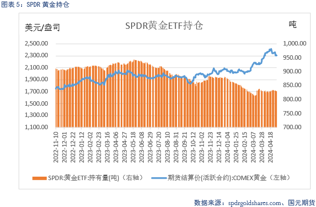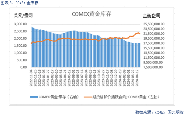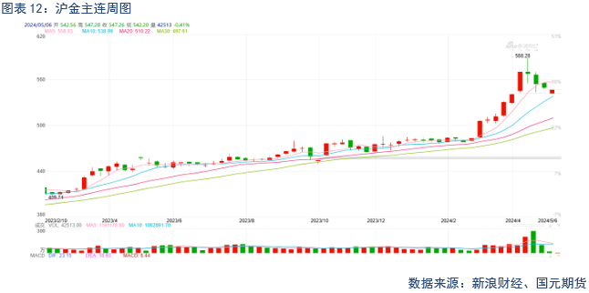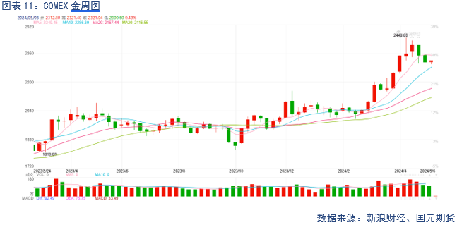 上周黄金价格小幅下跌。上周的FOMC会议上,美联储如期保持利率不变,鲍威尔表示降息比预期漫长但不太可能加息。美国4月非农就业人口增加17.5万人远不及预期,失业率上升,薪资增幅放缓至3.9%。美国4月ISM制造业意外降至49.2,重新陷入萎缩。美国4月ISM服务业指数降至49.4,为2022年以来首次萎缩。美国经济数据表现不佳,通胀指标有所降温,美元偏弱运行,逾三周新低。随着避险情绪的降温,同时黄金库存累库拐点已现,库存连续三周增加,但美元走弱对金价有支撑,预计金价跌势不会持续。