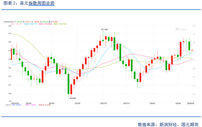 美元偏弱运行,逾三周新低。上周的FOMC会议上,美联储如期保持利率不变,鲍威尔表示降息比预期漫长但不太可能加息。美国4月非农就业人口增加17.5万人远不及预期,失业率上升,薪资增幅放缓至3.9%。美国4月ISM制造业意外降至49.2,重新陷入萎缩。美国4月ISM服务业指数降至49.4,为2022年以来首次萎缩。美国经济数据表现不佳,通胀指标有所降温。本周需关注美国5月4日当周首次申请失业救济人数、美国5月密歇根大学消费者预期指数初值以及欧元区4月服务业PMI终值等。