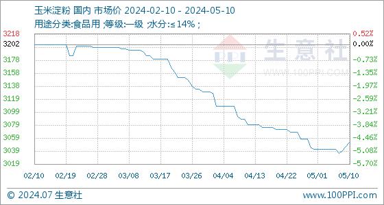 5月10日,生意社玉米淀粉基准价为3046.00元/吨,与本月初(3042.00元/吨)相比,上涨了0.13%。