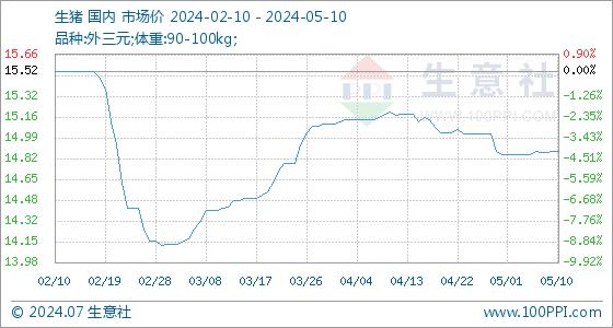 5月10日,生意社生猪基准价为14.88元/公斤,与本月初(14.85元/公斤)相比,上涨了0.20%。