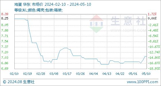 5月10日,生意社鸡蛋基准价为7.08元/公斤,与本月初(6.91元/公斤)相比,上涨了2.46%。