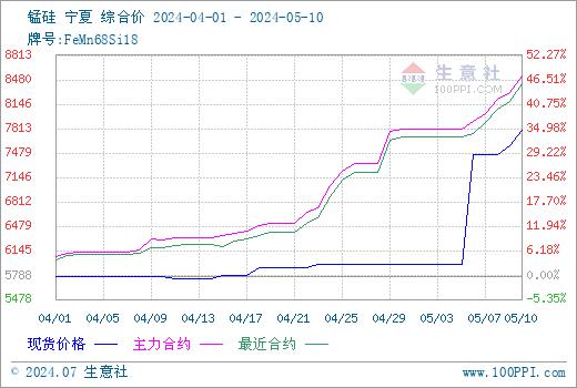 在5月节前,受澳洲港口发运受损情况的利多影响,硅锰及锰矿市场出现了价格混乱上涨的情况。而节后,澳洲港口问题持续发酵,锰矿价格继续飙升。外盘的South32对华2024年6月装船报价为南非半碳酸6.5美元/吨度,比前期涨了2.2美元/吨度。期货市场也持续向好,期现联动效应明显,现货价格较节前上涨了30.70%。根据生意社商品行情分析系统的数据显示,硅锰在宁夏地区(规格为FeMN68Si18)的市场报价在7700-7900元/吨左右,市场均价7783元/吨。