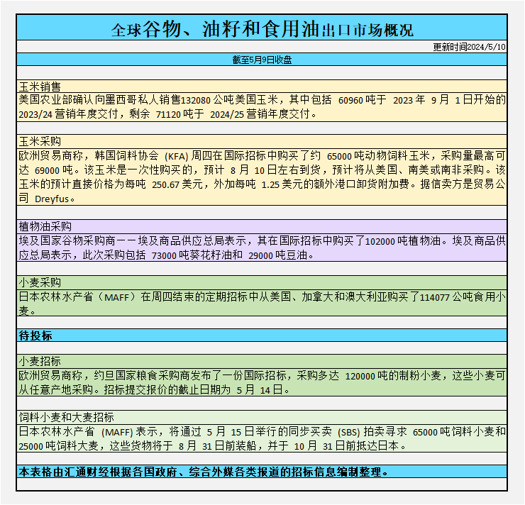 全球谷物、油籽和食用油出口市场招标、采购概况(2024/05/10):