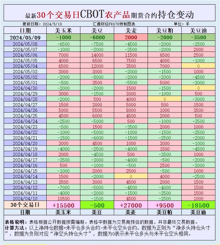 根据汇通财经观察,海外交易商估算的结果显示,本周四(5月9日),大宗商品基金增加CBOT美豆、美玉米、美豆粕、美豆油投机性净空头头寸,增加美麦投机性净多头头寸。最新30个交易日,大宗商品基金增加美豆粕、美麦、美玉米投机性净多头头寸,增加美豆油、美豆投机性净空头头寸。