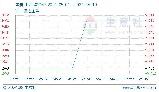 据生意社商品行情分析系统:2024年5月1日至5月10日山西地区焦炭市场第四轮提涨落地,截止5月10日准一级冶金焦出厂价格2063.33元/吨,涨4.83%。