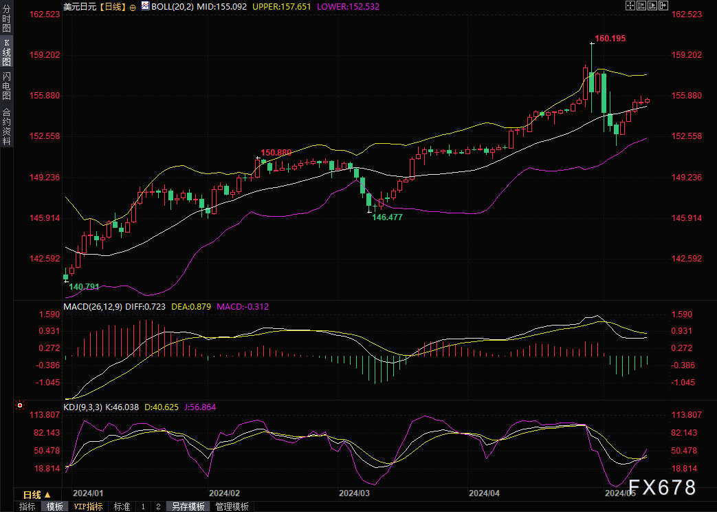 美元/日元重返156关口,可能会让多头在158水平上运行。突破158可能会支撑其向4月29日高点160.209移动。