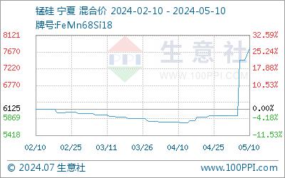 在5月节前,受澳洲港口发运受损情况的利多影响,硅锰及锰矿市场出现了价格混乱上涨的情况。而节后,澳洲港口问题持续发酵,锰矿价格继续飙升。外盘的South32对华2024年6月装船报价为南非半碳酸6.5美元/吨度,比前期涨了2.2美元/吨度。期货市场也持续向好,期现联动效应明显,现货价格较节前上涨了30.70%。根据生意社商品行情分析系统的数据显示,硅锰在宁夏地区(规格为FeMN68Si18)的市场报价在7700-7900元/吨左右,市场均价7783元/吨。[详细]