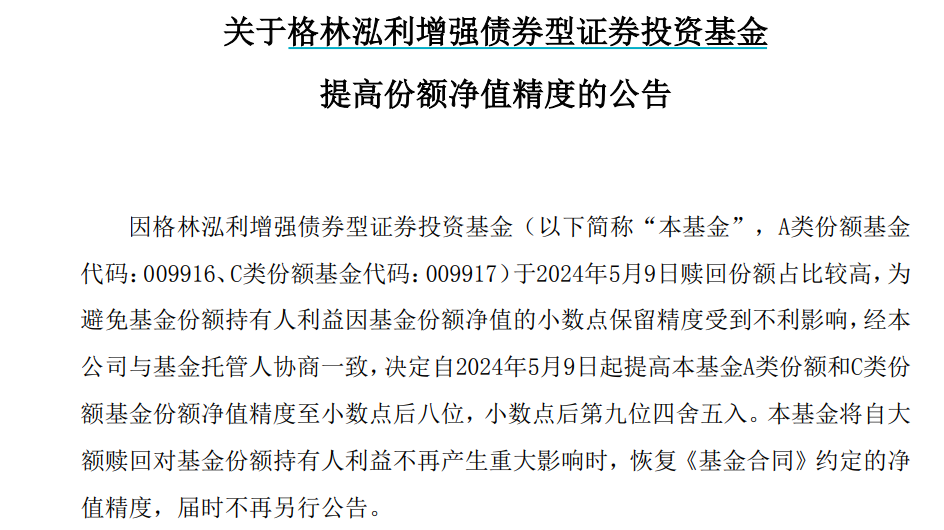 5月10日,格林泓利增强债券型基金发布公告称,由于2024年5月9日赎回份额占比较高,为避免基金份额持有人利益因基金份额净值的小数点保留精度受到不利影响,决定自2024年5月9日起提高本基金A类份额和C类份额基金份额净值精度至小数点后八位,小数点后第九位四舍五入。