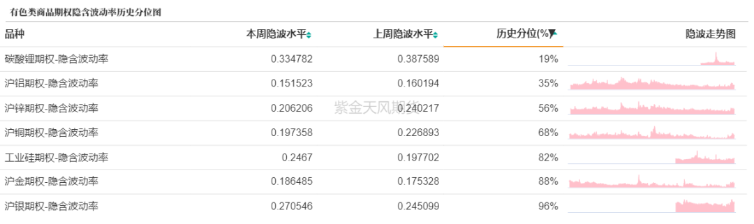 隐含波动率回顾:本周有色类商品期权各个品种主力合约隐含波动率,大多处于较高历史区间。