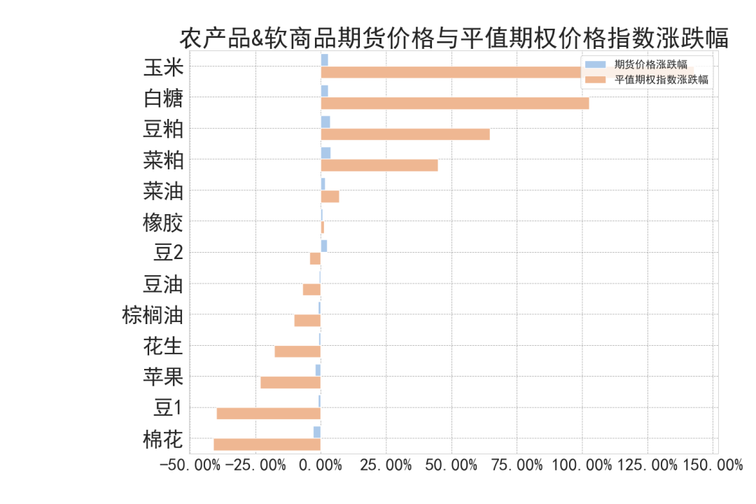 标的价格&平值期权价格指数:农产品&软商品期货价格波动不一,菜粕涨幅为:3.69%,豆粕涨幅为:3.65%。豆油跌幅为:0.76%,花生跌幅为:0.89%。平值期权价格指数方面,玉米较上周有较大涨幅,涨幅为:142.86%,白糖较上周有较大涨幅,涨幅为:102.74%豆2跌幅为:4.40%,豆油较上周有较大跌幅,跌幅为:6.95%;
