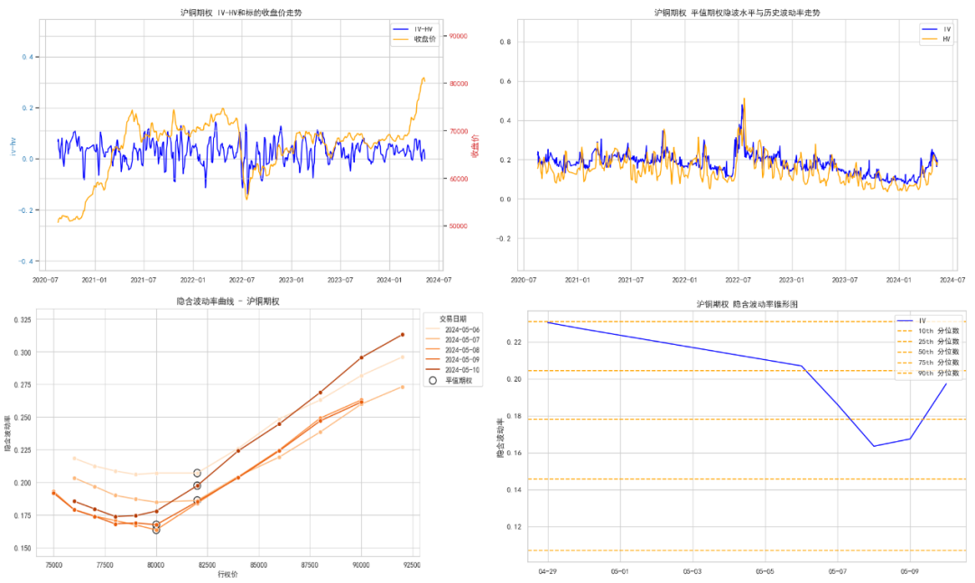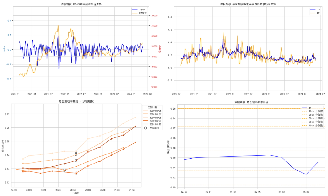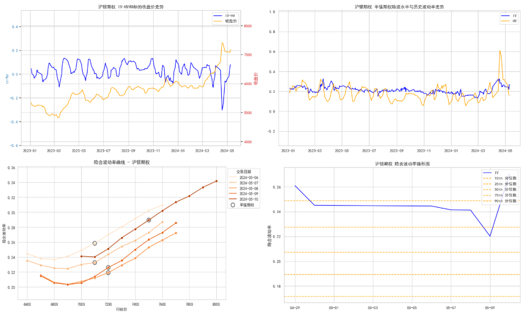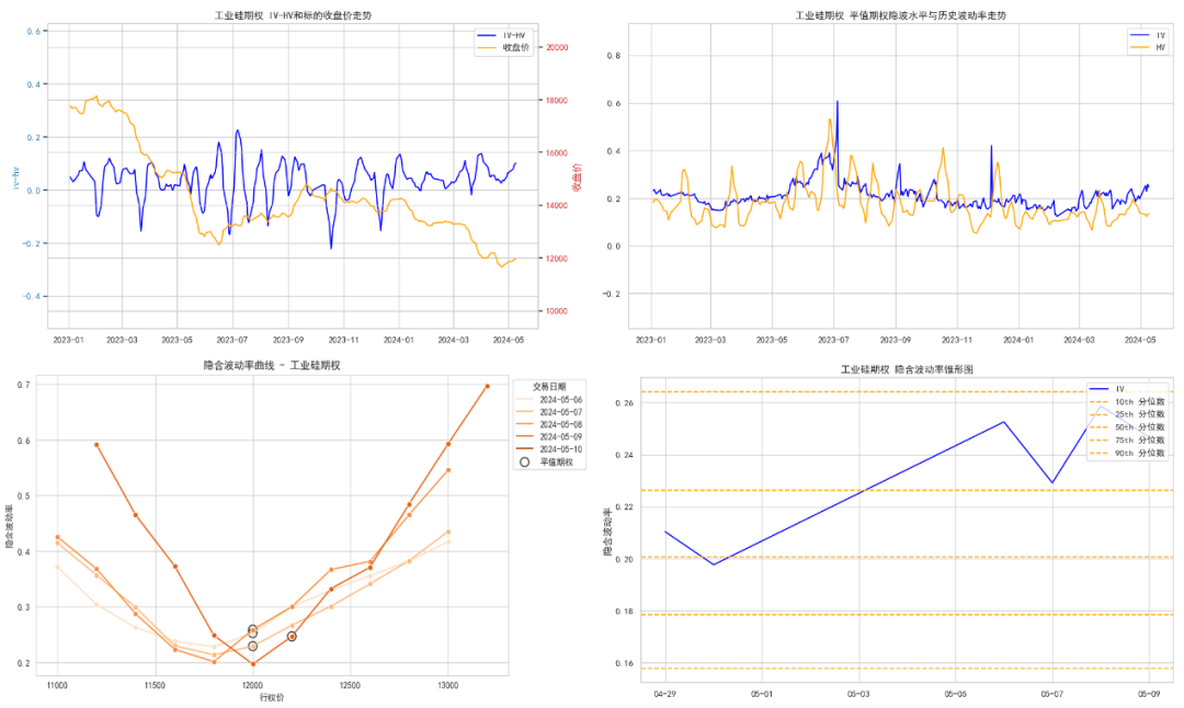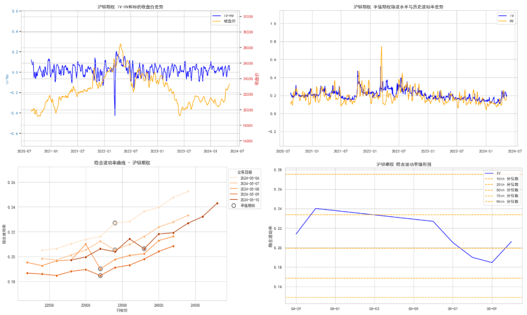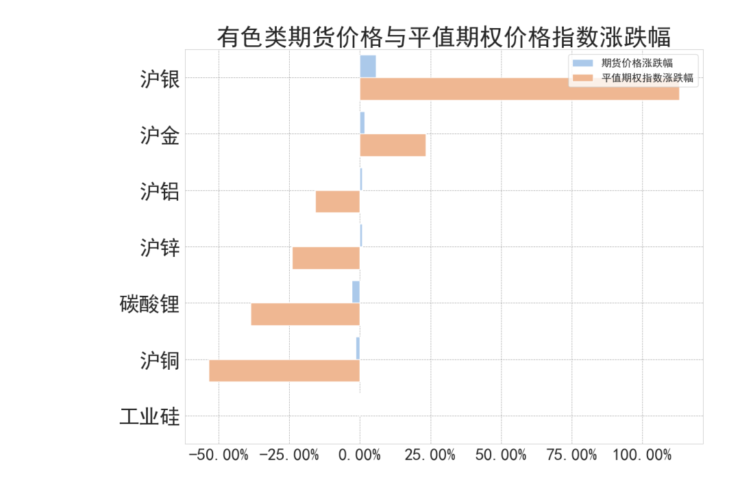 标的价格&平值期权价格指数:有色类期货价格波动不一,沪银较上周有较大涨幅,涨幅为:5.75%,沪金涨幅为:1.76%。工业硅跌幅为:0.25%,沪铜跌幅为:1.47%。平值期权价格指数方面,沪银较上周有较大涨幅,涨幅为:113.14%,沪金较上周有较大涨幅,涨幅为:23.28%沪铝较上周有较大跌幅,跌幅为:15.77%,沪锌较上周有较大跌幅,跌幅为:24.01%;